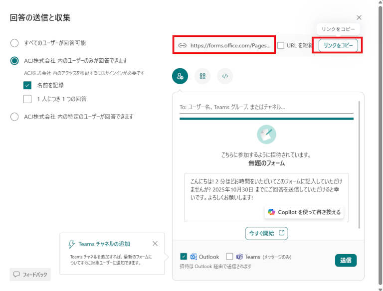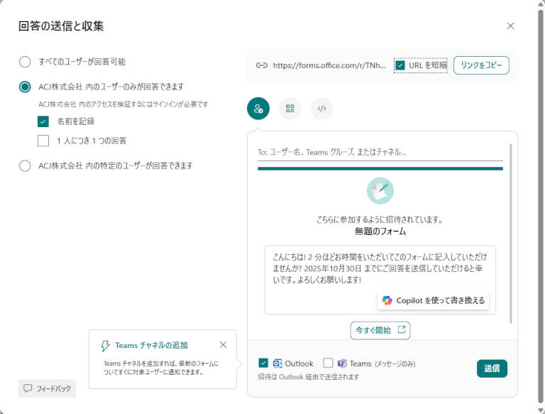 フォームは、URLを使って簡単に共有できます。フォーム完成後、右上の「回答を収集」ボタンをクリックすると、リンクの取得が可能です。共有範囲(すべてのユーザー/社内限定/社内の特定のユーザ)を設定したうえで、URLをコピーしてメールやTeams、社内ポータルなどに貼り付けるだけで配布できます。