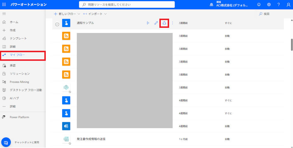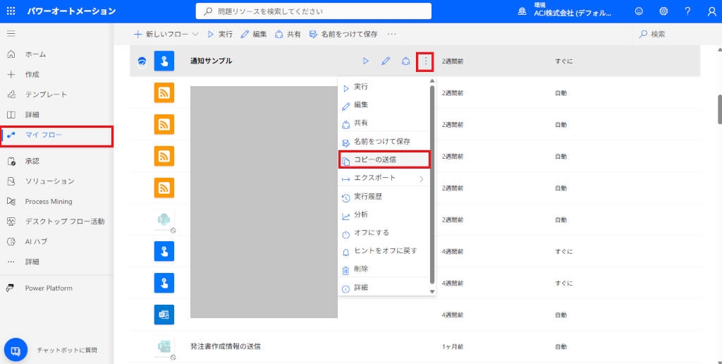 コピーされる側では、マイフローのクラウドフローでコピーされた、クラウドフローを確認することができます。